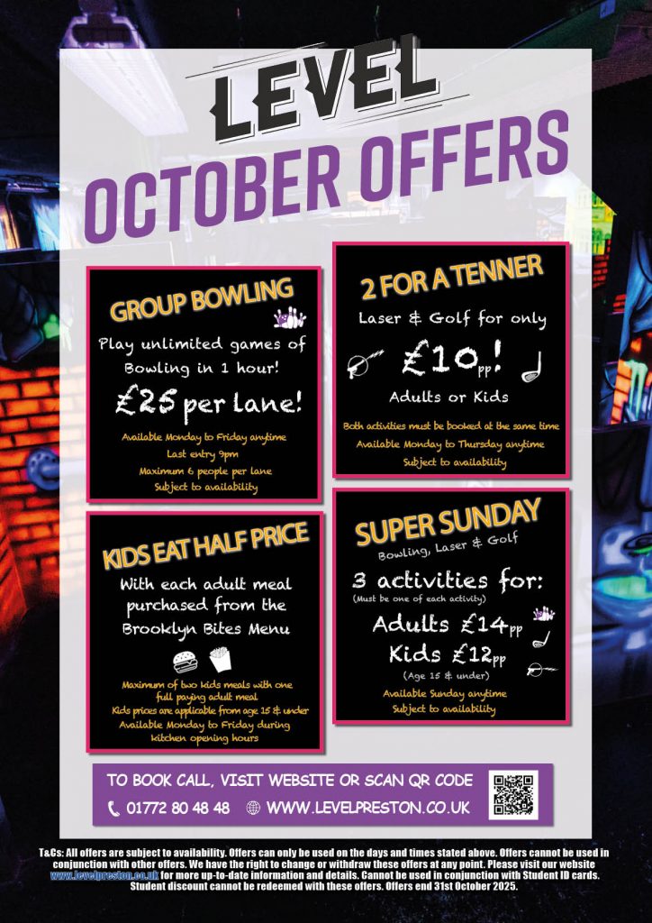 MONTHLY OFFERS! Please fill out the form below to send your booking requests and take advantage of these amazing offers: Select Activities*OCTOBER OFFERS: GROUP BOWLING (£25 per lane - max 6 people): - Mon-Thurs (Anytime)OCTOBER OFFERS: 2 FOR A TENNER: Laser & Golf - Mon-Thurs (Anytime)OCTOBER OFFERS: SUPER SUNDAY: Bowling, Laser & Golf: Sunday (Anytime)First Name*Surname*Email* Phone*Visit Date* Date Format: DD slash MM slash YYYY Time* : HH MM AM PM Number of People*MessageHow did you find out about this offer?*Please select (Your answer is important)TikTokGoogled itReceived EmailVia FacebookReceived TextVia InstagramVia a friend/work colleagueVia Kids PassVia Visit LancashireVia Day Out With The KidsLeaflet through the postOtherTerms and Conditions*T&Cs: All offers are subject to availability. Offers can only be used on the days and times stated above. Offers cannot be used in conjunction with other offers. We have the right to change or withdraw these offers at any point. Please visit our website www.levelpreston.co.uk for more up-to-date information and details. Cannot be used in conjunction with Student ID cards. Student discount cannot be redeemed with these offers. Offers are valid until the date specified on the poster. I accept the Terms and Conditions Marketing Opt-inI agree to Level (Preston) Limited keeping me informed with the latest offers, news and events it believes would interest me by (For further details, please see our Privacy Policy): Select All SMS Email EmailThis field is for validation purposes and should be left unchanged.